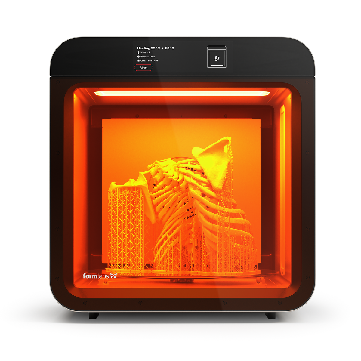 Form Cure L V2 brings validated, production-scale post-curing to your SLA workflow: high-power UV and rapid convection heating cure general resins in ~60 seconds and engineering or biocompatible materials in minutes, delivering stronger, tougher, and more heat-resistant parts with repeatable results. Built for the Form 4L ecosystem, it combines a compact footprint, 45+ validated presets, and customizable time/temperature controls so teams can accelerate throughput, maintain material certifications, and minimize process variability.